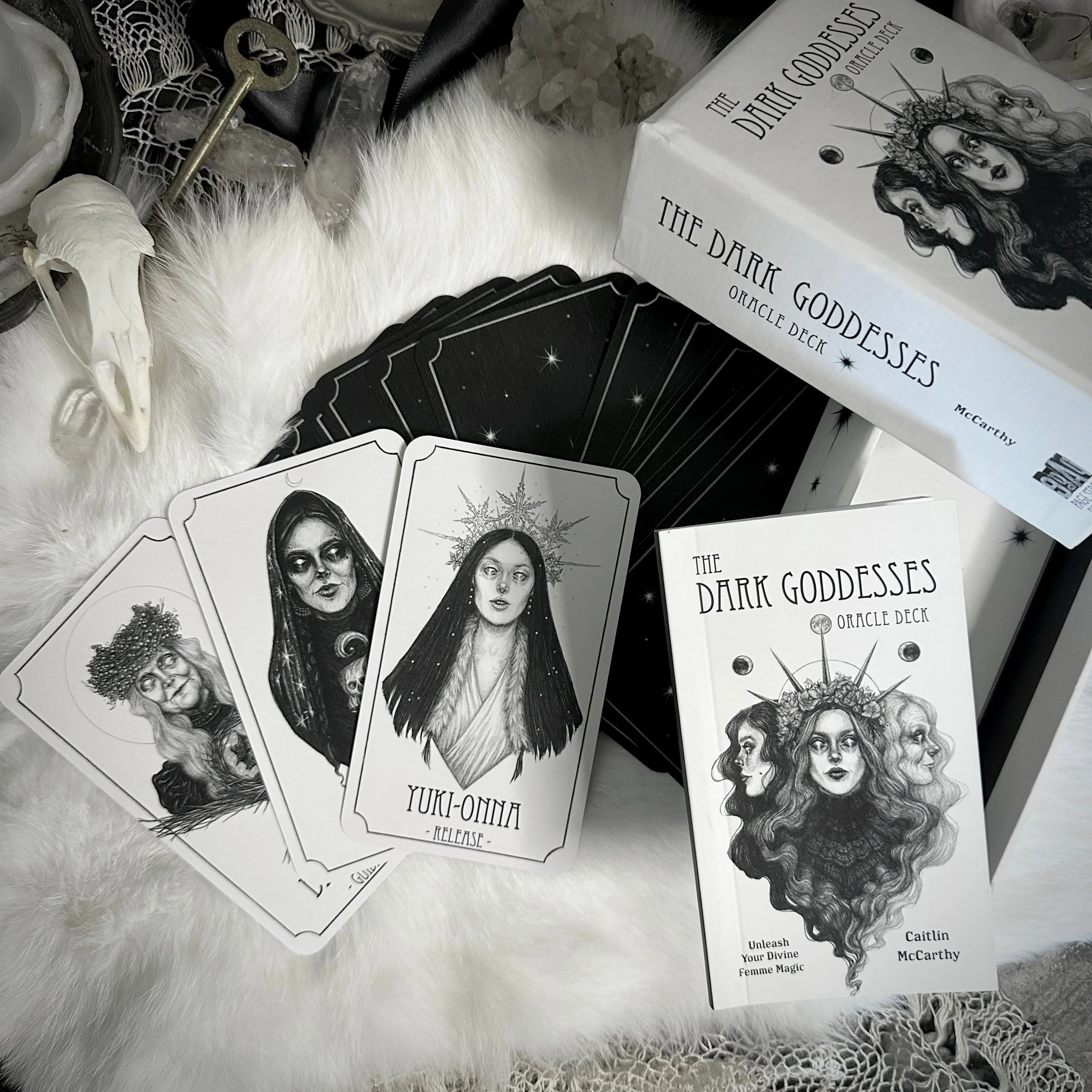 Through 60 oracle deck cards Caitlin McCarthy transports you into an elegant and macabre world of self-love and self-discovery. These carefully crafted illustrations feature goddesses from around the world who have been misunderstood across time. Revisited through Caitlin’s astute gaze they are symbols of power and freedom. Each card is accompanied in the guidebook by a myth, which explores the origins of the goddess, and a meaning that readers can apply to their own day to day. Delve into the worlds of Kali, Lilith, or Hecate, and let them guide you to the true meaning to your life.